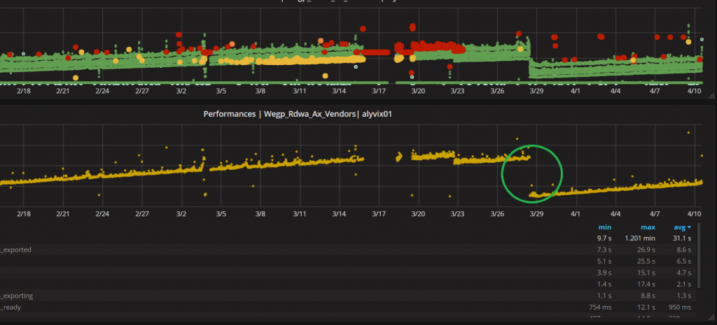 After some fixes, zooming in on the performance dashboard shows that the loading times are significantly lower (from 45 seconds to 10, at the green circle).